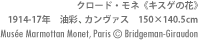 ジヴェルニーの庭は、モネが造り上げた作品のひとつです。庭師も雇いますが、庭造りが好きなモネは自ら花の種類と配置を考え、絵を描くように美しい庭を育てていきました。邸宅前の花の庭だけではなく、やがて敷地を広げ池を造り、睡蓮の咲く水の庭を実現しました。長男ジャンが死去し第一次世界大戦が勃発する1914年、モネは「睡蓮」の大作に取り組み始めます。オランジュリー美術館の大装飾画となるこの「睡蓮」も、ジヴェルニーの庭から生まれたものです。制作のためにモネは、敷地の一画にガラス張りの大きなアトリエを建てました。本章では、この大装飾画の準備のために描かれた作品を含む6点の「睡蓮」や、睡蓮の池のほとりで育てられた花々を描いた作品をご紹介します。