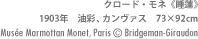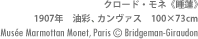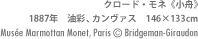 1893年、モネは自邸の向かいに新たな土地を購入し、水の庭を造り始めます。モネは、生涯で200点を超える睡蓮を描いたといわれ、季節や天気、時間、さらには描く視点を変えて移ろいゆく水面を捉えようとしました。