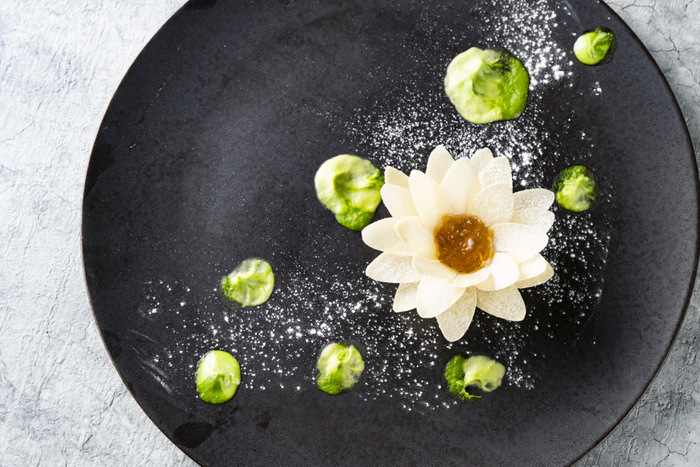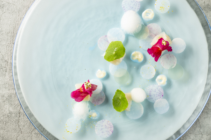 メインダイニング「レストラン ブリーズヴェール」が初めて展覧会とコラボレーションした特別メニューは、「見てひたる」「食べてひたる」「聴いてひたる」「香りでひたる」「触れてひたる」の演出を加え、睡蓮の世界観を一皿ごとに食材で表現。鑑賞後もモネを五感で感じながら余韻にひたっていただけます。