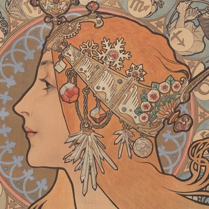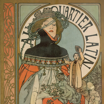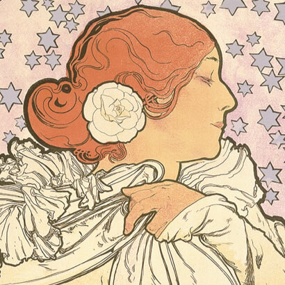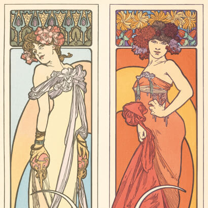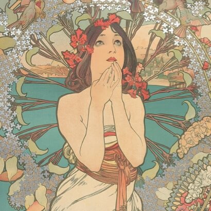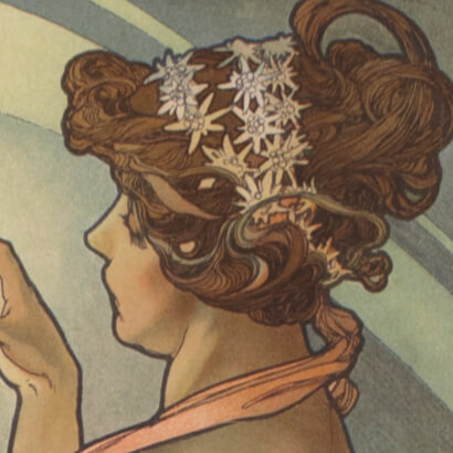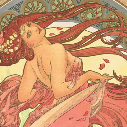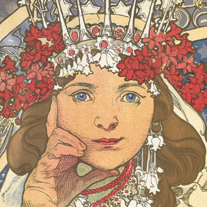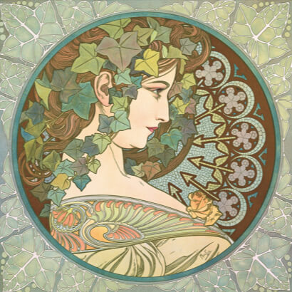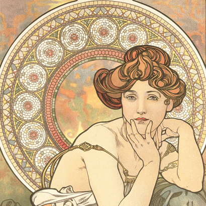 アール・ヌーヴォー様式の典型となったミュシャ様式は、特定の美術運動や芸術理論から派生したものではない。それは祖国独立の夢を抱くチェコ人のミュシャが、ウィーン、ミュンヘン、そしてパリという国際文化都市で画家としての修業を積むうちに、新しい時代の息吹に感応して創り出した独自のデザインの形式であった。