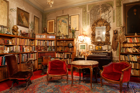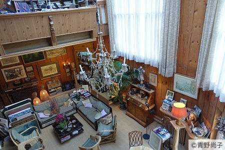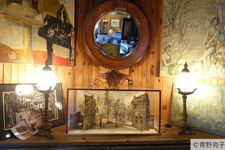 ちょっとした演劇ができそうなぐらい大きなアトリエの内部は、主にダニエルさんが使いやすいように改修されています。絵のほかに、舞台美術家だったダニエルさんが演劇のために作ったものも置かれています。テーブルや棚の小物が幻想的な絵の雰囲気を強調しています。ダニエルさんが亡くなったあとも、インテリアはほとんど変えていないそう。 「夫は天井の高さが気に入って、ここをアトリエにすることに決めたんです。大きな窓から光がたっぷり入ってくるのも魅力でした。パリではこんなぜいたくなスペースはなかなか見つかりませんから」と奥様は教えてくれました。ミュシャもたぶん、同じような理由でここにアトリエを構えたのでしょう。