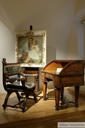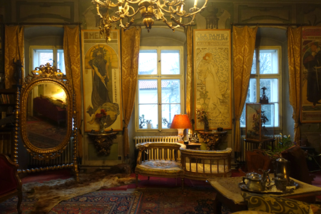 ミュシャ・ハウスのコレクションには、今となっては誰がどこで買ったのか、いつの時代のものなのかわからないものもたくさんあるそう。胸像、十字架、アール・ヌーヴォーの花瓶、ビロード張りのソファ、寄木細工の箱、剥製をいかにも生きているように配置したオブジェ、どうやって演奏するのかわからない楽器、革張りの表紙の本……。もしここが博物館だったら、学芸員は説明文をつけるのに苦労するでしょう。ミュシャの絵にも日本だけでなく、チェコやその他のヨーロッパの歴史や文化が複雑に融け合っていて、彼にしか描けないものがあります。ミュシャ・ハウスで彼の創作の秘密を垣間見たような気がしました。