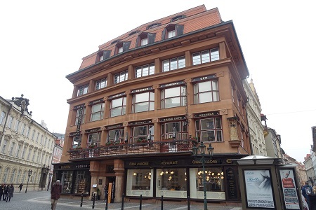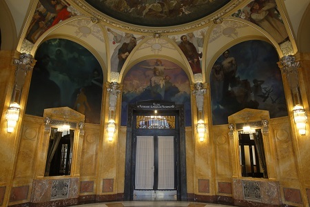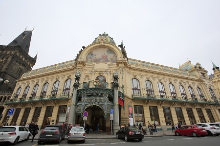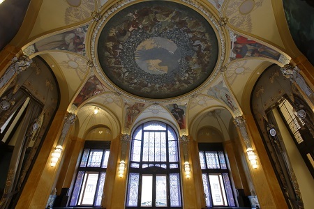 「市民会館」は、プラハ中心部の一大観光名所、旧市街広場からも近い一角にある、プラハ交響楽団の拠点「スメタナ・ホール」などがある複合文化施設です。建物正面にはモザイクでアール・ヌーヴォー・スタイルの絵が描かれていて、テラスの手すりにも繊細な装飾が。一階にあるカフェもアール・ヌーヴォーの香り高いおしゃれなスペース。が、実は私、これまで入ったことがありませんでした……。今回初めて、ミュシャが手がけた「市長の間」に足を踏み入れてみました。