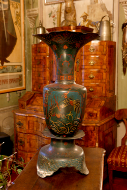 この家は1950年にジョンさんの父、つまりミュシャの息子であるイェジさんが購入したもの。ミュシャは1939年に亡くなっているので、彼がこの家に住んでいたわけではありません。空間を埋め尽くす謎めいたオブジェはアルフォンス・ミュシャ、イェジ、ジョンさんの三代にわたって集めたものだそう。部屋にぎっしりと並んだものの中でも、我々日本人としては日本的なものに目が行きます。日本での展覧会に出品される大きな金属の花瓶はやや西洋的ですが、輸出またはお土産用に作られたものかもしれません。この頃はゴッホやモネなど多くの画家が日本美術に影響を受けた作品を作っていますが、ミュシャも例外ではありませんでした。