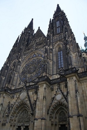 プラハにはもう1カ所、ミュシャの大作を見ることができる空間があります。プラハ城内にある「聖ヴィート大聖堂」のステンドグラスです。これがまたとにかく大きい!聖堂自体が「大聖堂」の名にふさわしく奥行き124メートル、幅が60メートルあり、ステンドグラスも近くに立つと上の方は見えなくなりそうな勢いです。ミュシャはここに、スラヴ民族にキリスト教を広めたキュリロスとメトディオス、2人の聖人の生涯を描きました。ポスターなどでは繊細な中間色を駆使するミュシャですが、通常のステンドグラスと違い、ガラスに油彩で描いているのでビビッドな色使いに驚かされます。「市民会館」と「聖ヴィート大聖堂」、二つのミュシャ空間が訪れる人を圧倒するプラハは、やはり奥が深いのです。