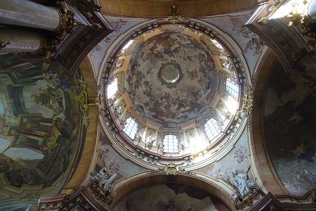 「百塔」の中でもひときわ目立つのがプラハで最も有名なバロック建築「聖ミクラーシュ教会」です。こちらも「ストラホフ修道院」と同時期の18世紀に再建されたもの。鐘楼の高さは79メートル、その脇に立つドームの直径は20メートル、ドーム内部の高さはおよそ57メートルもあります。こちらは「ストラホフ修道院」よりさらに密度の濃い装飾がみものです。祭壇にはバロック特有のねじれた柱が、天井にはびっしりと絵が描かれています。ミュシャをはじめとするチェコの人々の遺伝子にはこんな美意識が流れているのです。