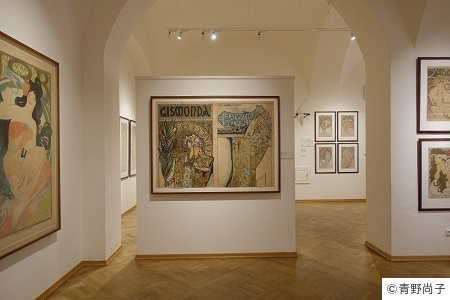 ミュシャについて、ちょっとレアな資料を揃えているところがプラハにあります。1998年にミュシャ財団の協力で開館した「ミュシャ美術館」は世界で唯一のミュシャ専門の美術館。7つのセクションにわけて彼の作品を紹介しています。たとえばポスターでも完成品はもちろん、校正刷り(色などを確認するためにテストとして刷ったもの)を展示しているのがユニークです。彼のポスターのうち、女優などをほぼ等身大で印刷した縦長のものは一度に刷ることができないので2つに分割して印刷し、あとから継いでいました。館内に並ぶ貴重な校正刷りからはそんな発見もあります。