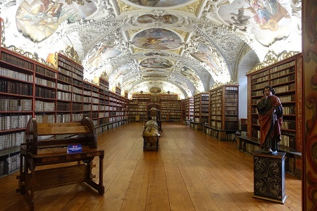 ただ街を歩いていても面白いプラハですが、ぜひ中に入ってほしい建物がいくつかあります。12世紀に創建され、17〜18世紀にバロック様式で再建された「ストラホフ修道院」はその一つ。教会やブリュワリー(ビール醸造所)などいくつかの建物がありますが、中でも図書館の天井画はため息が出るほど美しいもの。ここには「哲学の間」「神学の間」の二つの部屋があり、あわせて10万冊以上もの本を所蔵しています。印刷術が発達する前の時代の本はとても高価なものでした。壮麗な装飾には貴重な本にふさわしい空間を、と願った人々の思いが感じられます。