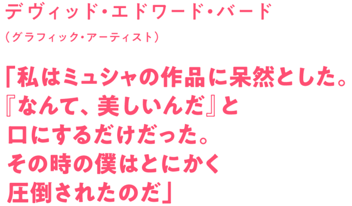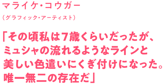 1963年、ヴィクトリア&アルバート博物館で開催された回顧展を契機に再評価されたミュシャ。それはスウィンギン・ロンドン時代の若者たちだけでなく、ベトナム戦争への反戦運動から生まれたフラワー/ヒッピー・ムーヴメント~ラヴ&ピースに湧くアメリカの若者たちの間でも、魅力的なデコラティヴ・アートとして同時に再発見されることになる。その一因として、ミュシャが活躍した1900年前後のベル・エポック(良き時代)と呼ばれた時代の空気と、古い価値観に対するカウンター・カルチャーとして若者文化が初めて花開いた60年代という時代の空気が、どこか似通っていたからかもしれない。
