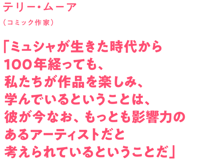 ミュシャのポスター・デザインは、1985年以降に出現するアメリカの「モダン・エイジ」世代のコミック作家に大きな影響を与えた。人気コミック・シリーズ『ストレインジャーズ・イン・パラダイス』でウィル・アイズナー漫画業界賞を受賞したテリー・ムーアや、マーベル・コミックの元主筆(現チーフ・クリエイティブ・オフィサー) ジョー・ケサダは、アート・スクールの学生だった頃に画集を通してミュシャに出会い、ミュシャの画力ー三次元の世界を二次元の平面上に活写する線的表現の力と様々な構図上のテクニックーに薫陶を受けたという。やがてこうしたインパクトは、ダイナミックな曲線表現やミュシャ的な装飾モティーフと円を活用した構図となって、彼らのコミック・スタイルの中に取り入れられていく。