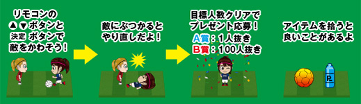 - ③ 決定ボタンでゲームスタート!上下ボタンや決定ボタンを使ってディフェンスをかわそう!!