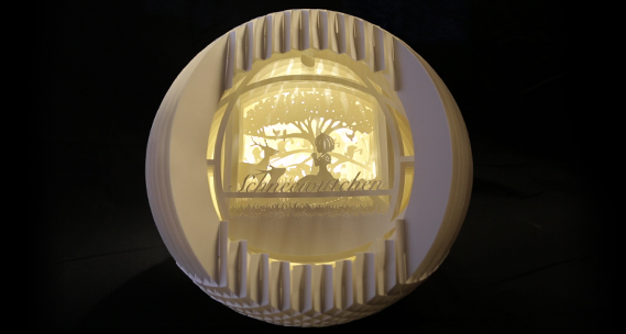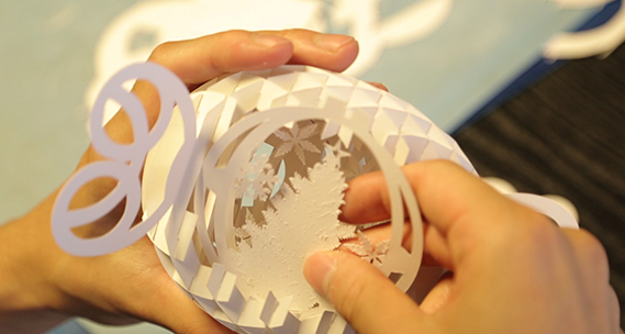 開いて形を立ち上げる従来のカードではなく、カード自体が立体的な形になる「ポップアップカード」を考案。およそ20のパーツを組み合わせ、接着剤を使わずに立体的な球体に作り上げている。固定させるには、0.1ミリ単位で設計するのに苦労したが、貰って喜ばれるので、自分で作っていて楽しかった。