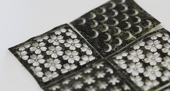 海藻食に注目してもらおうと友人のアートディレクターと考案。海苔そのものにデザインを施した。日本古来の文様をモチーフにして、長寿や子孫繁栄など願いを込めたデザインを選んでいる。海外へのお土産や記念品として注目されている。