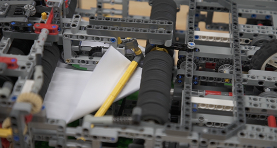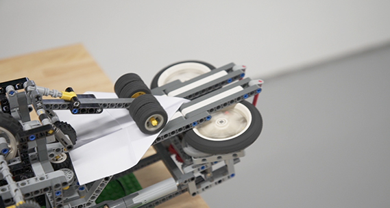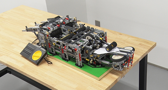 紙をセットするだけで、自動的に紙飛行機を折って飛ばせる機械。しかも、レゴブロックで作られている。注目すべきは、紙飛行機の先端部分を三角に折る工夫。乗り物の車軸に使う棒状のレゴパーツが行く手を阻むことで三角に折ることができた。