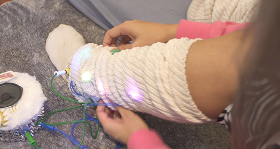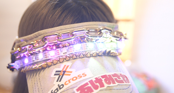 自ら電子工作をして、より一層キラキラ輝きたいと考案。仕込んだ基盤がソックスの上げ下げに反応して音が鳴る「ルーズソックスシンセサイザー」。ギャル必須、Wi-Fiの電波の強さをスキャンして光る「可視化するサンバイザー」などの作品を作っている。
