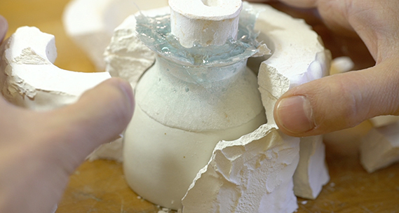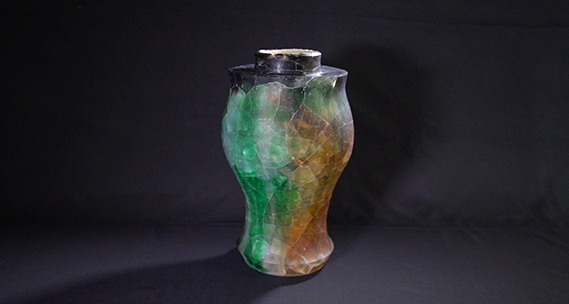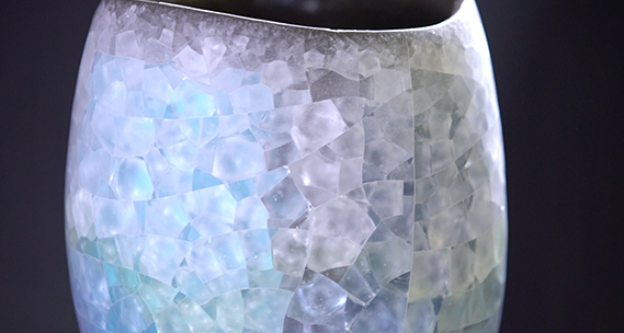 陶器とガラスを組み合わせた、ヒビを楽しむ作品。手で触って自由に成形できる粘土と、透かしたり反射させてキラキラするガラス、この2つの素材を組み合わせれば、面白いモノができるのではと考案。独自の技法はさらに進化。色をランダムに入れることで、ヒビを境に色が変わったように見える。