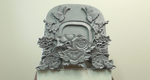 - 女性らしい作品に挑戦する、鬼瓦職人。