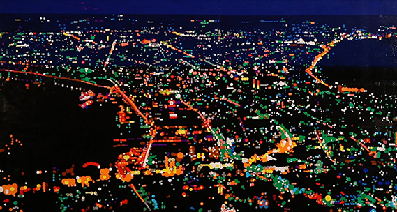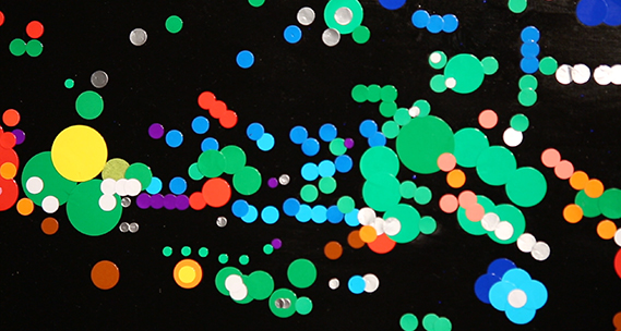 もともと丸や点で抽象画を描いていた。たくさんの円を描く作業はかなり困難。そんな時に貼るだけで円も色も簡単に表現できる「丸シール」と出会う。色や大きさなど種類も豊富で貼るだけでできる「丸シールアート」を考案。