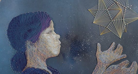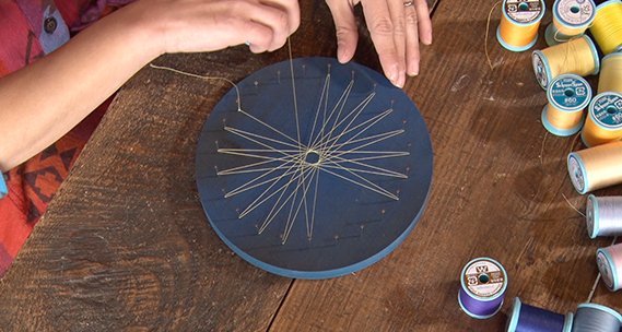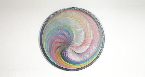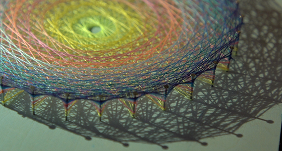 円形に打った釘に規則的に糸をひっかけて作る「糸かけ数楽アート」。直線的な線を組み合わせる事で曲線も表現でき、高さを変える事で、立体感や影ができ、より魅力的に。さらに、釘を円ではなく、自由に配置する事で、躍動感のある作品に進化させている。