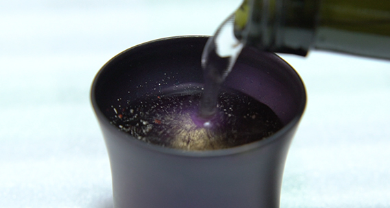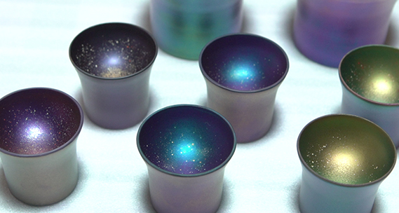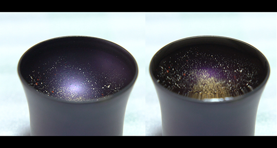 お酒を注ぐとまるで宇宙のように見える幻想的な器。使うのは、漆で描いた絵の上に金粉などを付着させる仏壇作りの技。ただし、筆ではなくスポンジを使い、小さい星を表現。「少しつけたら窯で焼く」を何度も切り返す事で、星が浮かび上がり輝きが増してくるそう。