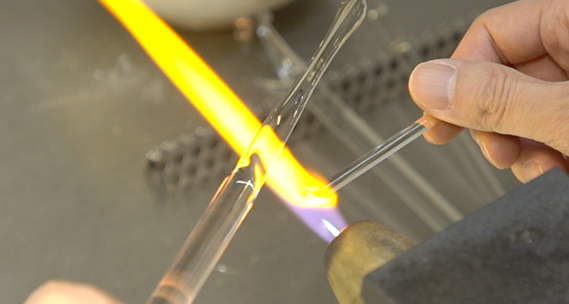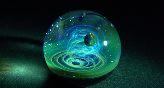 わずか1インチの小さなガラス玉の中に広がる神秘的な宇宙を作り出す。この幻想的な作品は、金や銀の粒子をガラス棒に付着させ、バーナーの熱で別のガラス棒に飛ばして着色している。さらに、微妙な火加減でらせんを作ったり、わざと気泡を散りばめて無数の星が広がっているさまを作り出したりして、壮大な宇宙を表現。他にも花やクラゲなども制作。