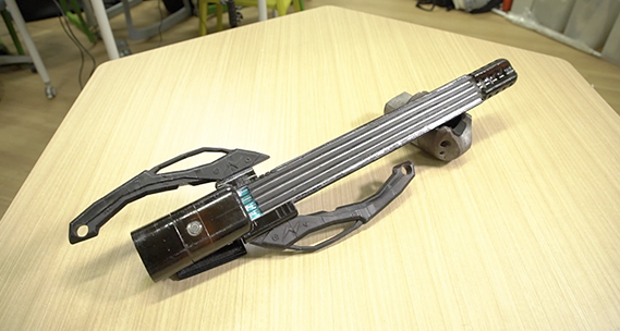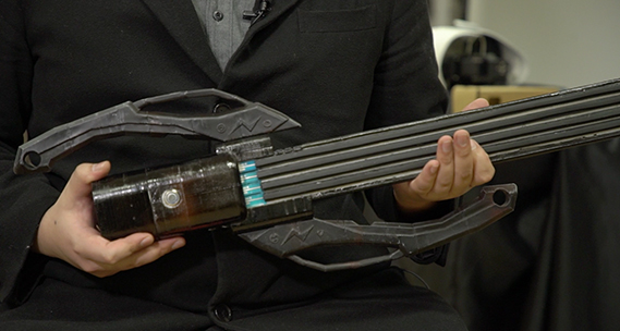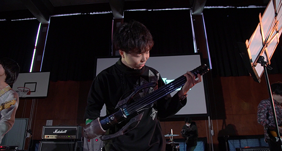 義手の方でも、手軽に演奏できる義手楽器「Musiarm(ミュージアーム)」。義手にはりつけた特殊な弦は、押すとセンサーが反応。片手でも音が出せる仕組み。しかも傾けるだけでエフェクトもかかる。