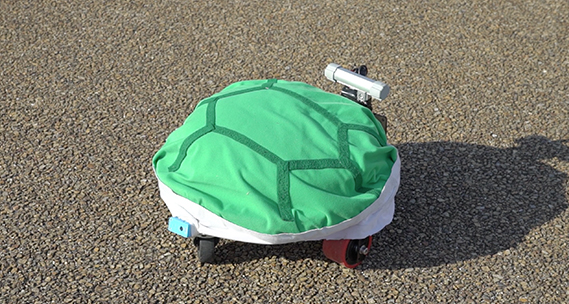 乗る人も、見ている人も楽しくなれる、「移動を楽しむ」乗り物が作りたいと考案したのは、竹ぼうきにまたがって走る愉快な乗り物。ほかにも、ワイヤレスのハンドルで操作できる車や、バナナを見つけると回転するもの。さらに、スカートに電気を通す布をつけ、台車と連動。スカトーに触る事で動かせるものなど、楽しさいっぱい。