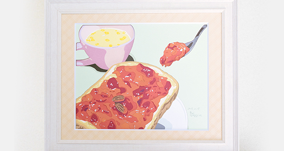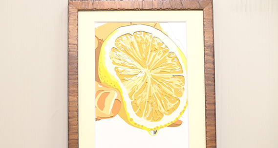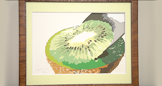 紙を何層にも重ね、一枚一枚彫り込み出したい色を浮かび上がらせていく「彫紙」という技法。さらに進化を遂げ、食べ物の「動き」を表現するように。果物の雫が滴り落ちる感じや、スプーンですくわれた果肉を、光で立体的に表現している。
