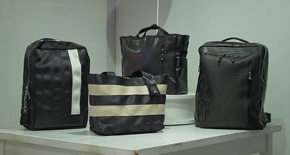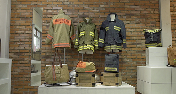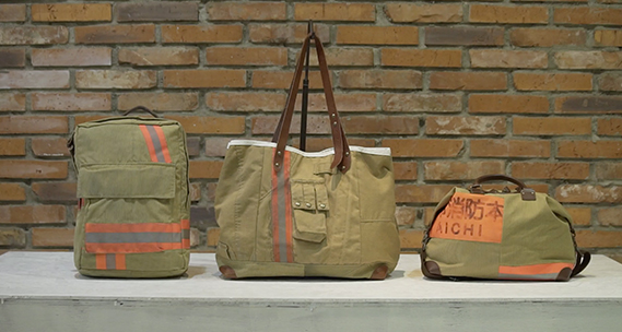 名古屋市では毎年大量の消防服が廃棄されるが、不燃性なので焼却処分ができないでいた。そこでバッグとして再生を考案。消防服のかすれや傷もそのまま残すようにしている。さらに夜間でも安全な反射帯など、消防服ならではの機能を生かしたデザインが海外からも注目されている。