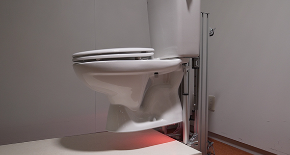 きっかけは、男性が用を足す際に股間の高さと便器にギャップがあるから、飛びはねなど汚れが発生して、その掃除が面倒だと仲間と話したこと。そこで、使う人の好みの高さに便器をモーターで昇降させ、飛びはねで汚れないトイレを考案した。まだ試作段階だが、立ち座りの動作が困難な方がいる施設に実装できればと考えている。
