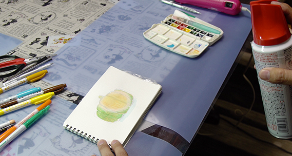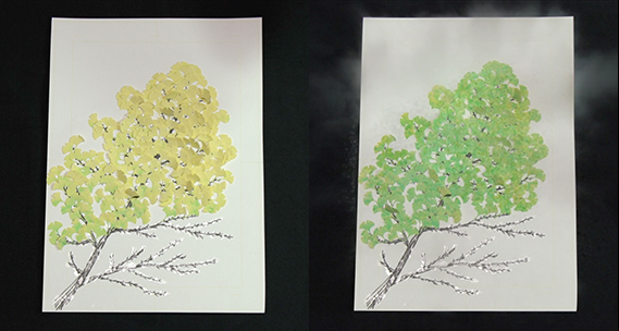 高温の工作用ドライヤーなどで熱を加えると、絵が変化する「チェンジアート」。擦ると摩擦熱で消えるペンの特性に着目。普通にペンや絵の具で絵を描き、変化させたいところに摩擦熱で消えるペンを使う。熱を加える事で絵が変化する仕組み。