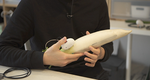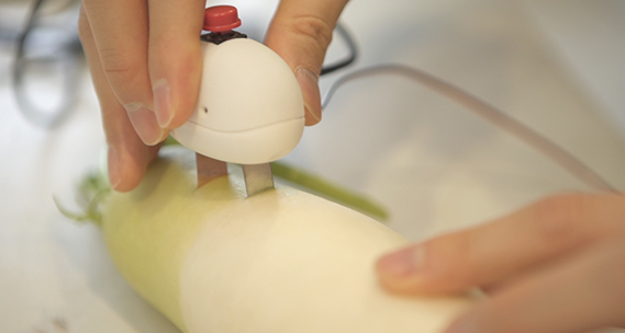 実はこのアイテム、コンピューターが搭載されていて、金属部分を野菜に刺すと電圧が発生し音が出る仕組みになっている。野菜の水分量によって電圧が変わり、音色も変わる。タッチセンサーで音の出し方も様々、ギター・ベース・ドラムと使い分けることもできる。これらを融合して「Yasai Band」に。