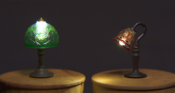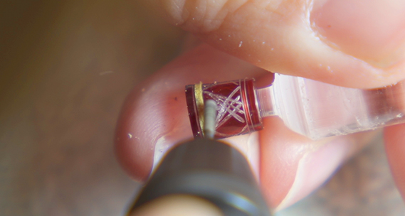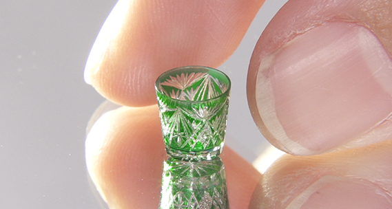 実はこれ、なんと高さ7ミリの極小の切子グラス。直径1センチのアクリル棒を薄く削って作られている。着色後に、切子模様を彫っていく。切り口がキラキラするようにつまようじの先を削って細くして、切り口を丁寧に磨いている。極度の集中力を要するので1日にわずか1個しか作れない。