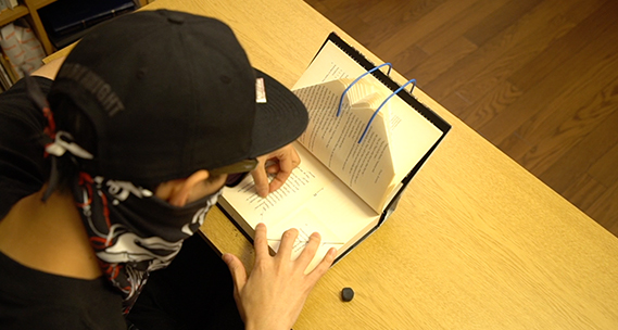 新書は使わず、中古の本により価値を与えたいと「ブックフォールディング」というアートに取り組んだ。本のページを折ることで、文字やイラストを描いていく。デザインを決めたら、エクセルでページごとに折る場所を計算し、正確に折っていく。0.1ミリずれてもきれいな作品にはならない。どんな細かい図柄でも、ページは絶対に切らない。時間がたって黄ばむと、さらに作品に深みが出るのも魅力。