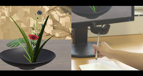 デジタル技術で生け花を体験できる装置。パソコンで使うワイヤレスのトラックパッドを剣山に、タッチペンを花に見立て、リアルに再現している。花や道具を揃える手間もなく、スライドするだけで花は選び放題。失敗したらその花がもったいないが、この装置ならすぐに復元することができて材料費もかからない。