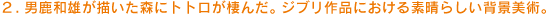 数多くのスタジオジブリ作品の美術に携わってきた男鹿和雄。中でも美術監督を務めた「となりのトトロ」、「おもひでぽろぽろ」、「平成狸合戦ぽんぽこ」、「もののけ姫」においては、高畑、宮崎両監督と議論を交わし、その世界観を追及してきただけに、男鹿自身の意思と両監督の想いが刺激しあい、映画の素晴らしい舞台が誕生した。これらの作品は、三鷹の森ジブリ美術館で展示されている数点を除いて、スタジオジブリに関連するイベントにおいても一般に公開される機会は極めて少ない。この展覧会で初めて実現する、貴重なチャンスだ。