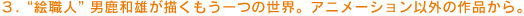 ここではアニメーション以外の場で評価される男鹿和雄の世界を観ることができる。女優吉永小百合からの協力依頼に応じて描いた「第二楽章」シリーズでは、原爆詩の朗読の傍らに在りながらも、やさしく、温かい絵が描かれた。絵本「ねずてん」(原作:山本素石)や、DVD・絵本「種山ヶ原の夜」(原作:宮沢賢治)では、原作のストーリーを効果的に伝えるため、どこか懐かしい民話の匂いを感じさせる画風にするなど、多様なチャレンジがなされている。その他、雑誌の表紙や山々を歩いて描いたスケッチなど、日本の四季を切り取ったさまざまな作品を展示。多彩な画風とテーマから、日本人の心に通じる数多くの風景画を通じて、男鹿和雄の情熱を、その場で体感することができる。