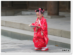 桃(もも)ちゃん(3歳9か月)は、きれいに着物で着飾って、今日は七五三のお祝いです。お母さんはこの三嶋大社でおつかいを頼むことにしました。タイのお守りと、箱入りのお団子を3箱買ってくるおつかいです。