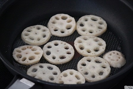 1.レンコンは皮を剥いて、5mm幅くらいの輪切りにし、水にさらす。![]()