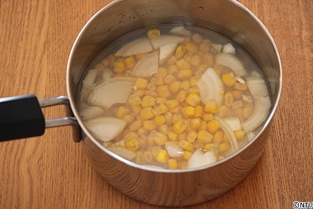 2.鍋に水、玉ねぎ、コーン缶(漬け汁ごと)を入れて火にかけ、