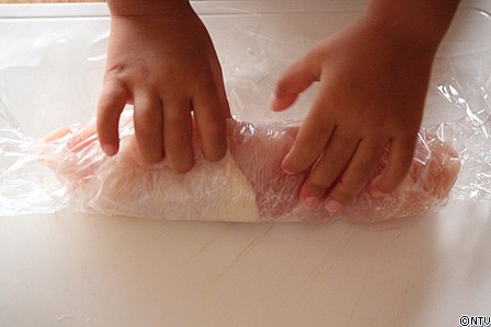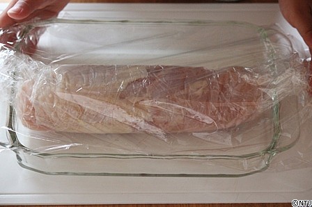 3.鶏肉を取り出してくるっと巻いてラップでくるむ。両脇は閉じなくてO.K.