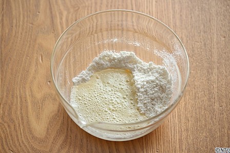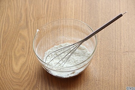 1.深めの耐熱容器に小麦粉を入れて泡立て器でよく混ぜる(☆)。