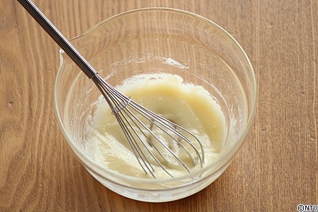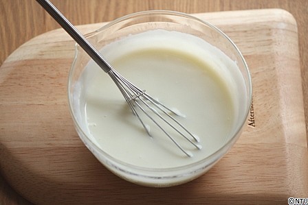 2.1をよく混ぜ合わせ、滑らかになったら牛乳を少しずつ加えて混ぜる。