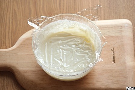 バターを入れ、電子レンジ(600W)で30秒~1分、バターが溶けてぶくぶくとするくらいまで加熱する。