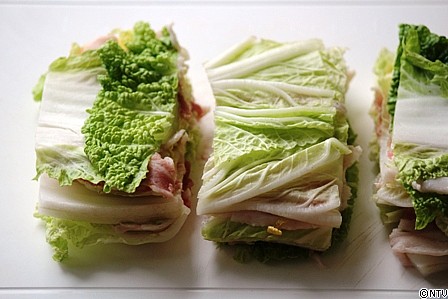 2.白菜と豚肉を交互に重ねる。(白菜の芯の部分が交互になるように)。