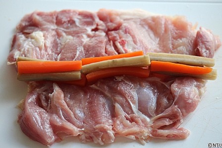 3.1の煮汁をよく切り、鶏肉に各2本ずつ並ぶようにのせる。