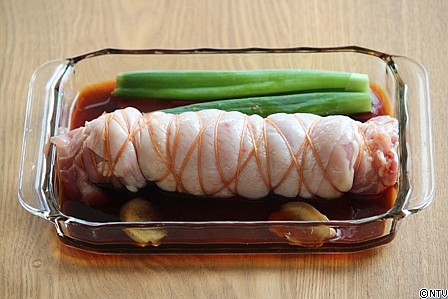 レンジで鶏チャーシューの八幡巻きが出来るんですね。