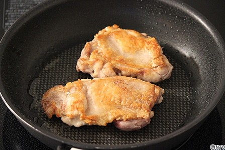 3.フライパンに油を熱して、2の皮目から焼く。出てきた油はキッチンペーパーでふきとる。