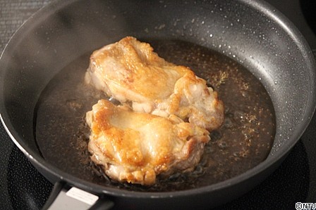 5.蓋を開け、合わせて置いたAを加えて、鶏肉に煮汁をかけながら軽くとろみがつくまで煮詰める。