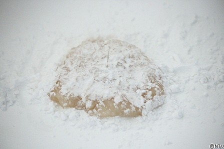 2.片栗粉をたっぷりと敷いた台にだし、上にも片栗粉をかける。